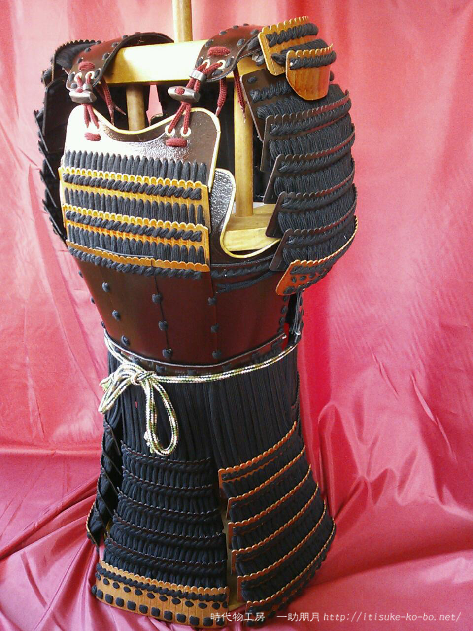【オーダー作品】姫武者甲冑「胸取縅縦矧胴」 女性向けにお客様の思いを取り入れデザイン、作成いたしました。 華やかさと勇壮さを調和させたこだわりのデザインです。 長側(って言っていいのか?)を気持ちショート丈に取り、草摺りを長く取り、女性らしいラインを重視しました。 黒・金・茶潤みの三色に絞った色使いが程よいポイント存在感を醸し出してます。 揃いの籠手・脛当て。家地のマルーンカラーが絶妙のアクセントです。